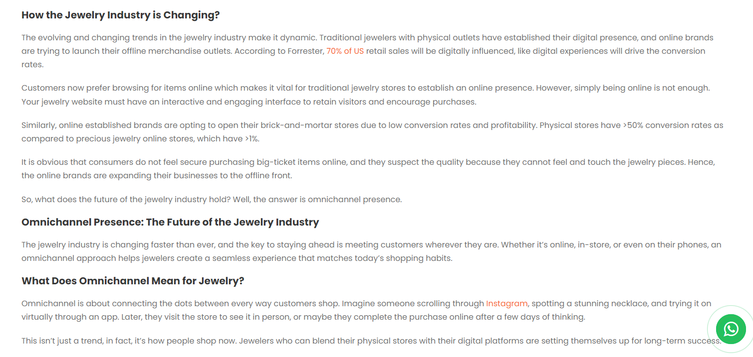 The evolving and changing trends in the jewelry industry make it dynamic. Traditional jewelers with physical outlets have established their digital presence, and online brands are trying to launch their offline merchandise outlets. According to Forrester, 70% of US retail sales will be digitally influenced, like digital experiences will drive the conversion rates.