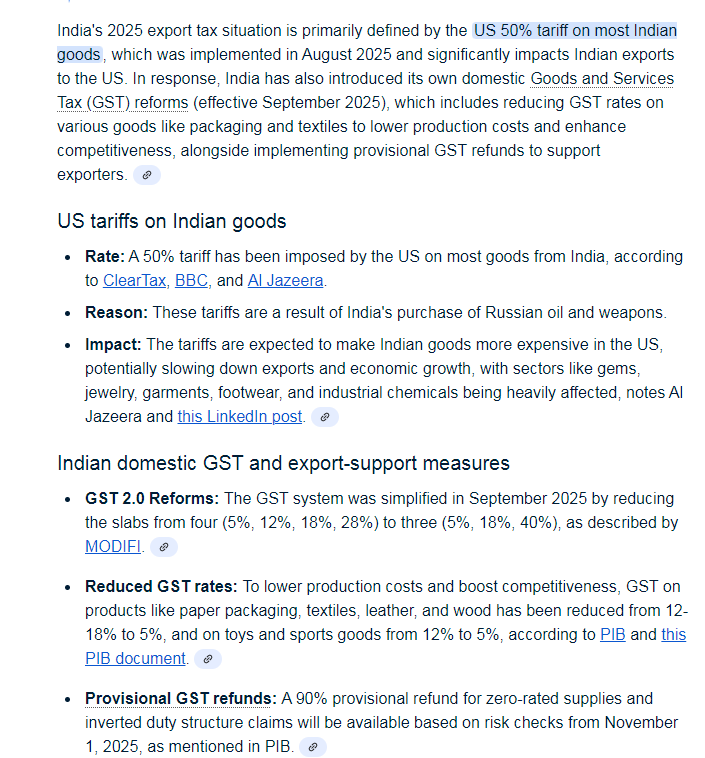 India's 2025 export tax situation is primarily defined by theUS 50% tariff on most Indian goods, which was implemented in August 2025 and significantly impacts Indian exports to the US. In response, India has also introduced its own domestic Goods and Services Tax (GST) reforms (effective September 2025), which includes reducing GST rates on various goods like packaging and textiles to lower production costs and enhance competitiveness, alongside implementing provisional GST refunds to support exporters.